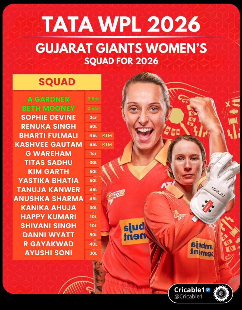 - Gujarat Giants Women – Ashleigh Gardner, Beth Mooney, Sophie Devine, Renuka Singh Thakur, Georgia Wareham