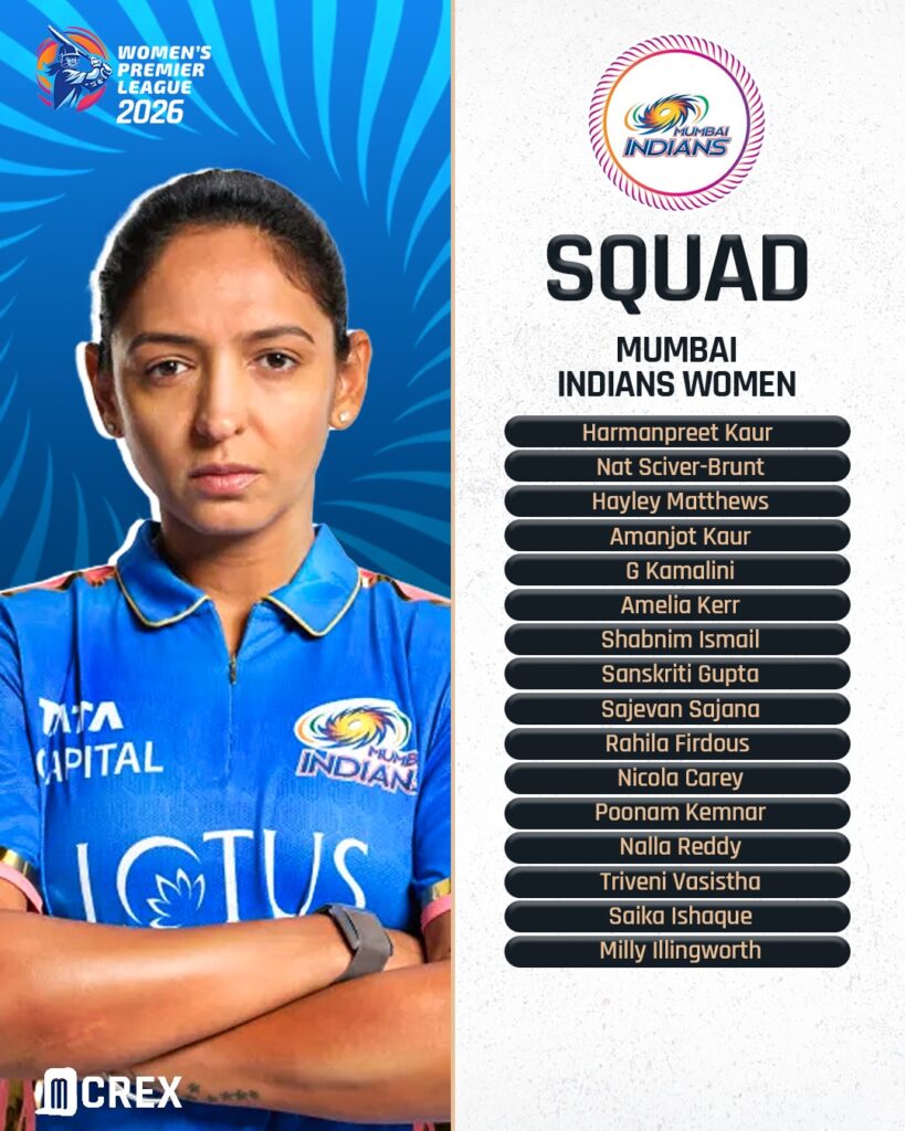 Harmanpreet Kaur (c), Nat Sciver-Brunt, Hayley Matthews, Amanjot Kaur, G. Kamalini, Amelia Kerr, Shabnim Ismail, Sanskriti Gupta, Sajana Sajeevan, Rahila Firdous, Nicola Carey, Poonam Khemnar, Triveni Vasistha, Nalla Reddy, Saika Ishaque, Milly Illingworth